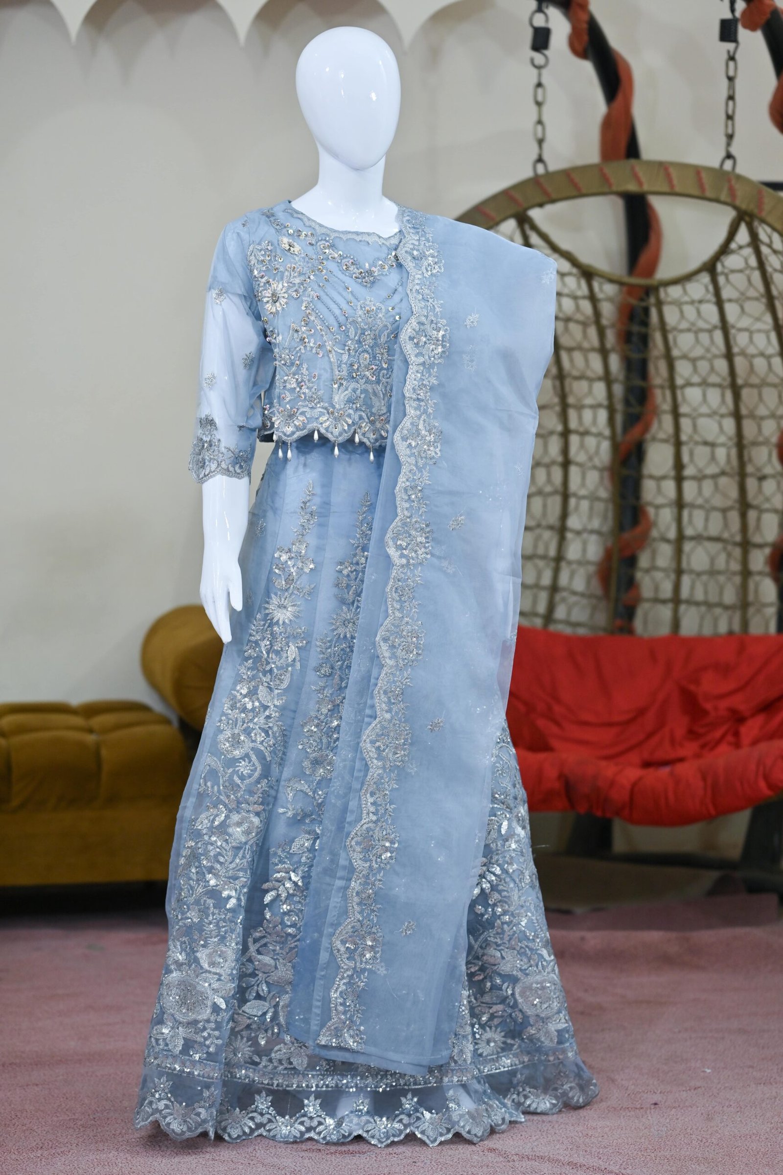 We fully understand that the ice blue lehnga is one of the most preferred outfits among Pakistani women. This shade looks extremely elegant, especially when a dress is made from high-quality organza fabric.That is why Ayesh Boutique has introduced a three-piece organza ice blue lehnga, which is being highly appreciated by our customers.We are very happy to share that we are receiving such a high volume of orders that it has become challenging to keep up with the demand.